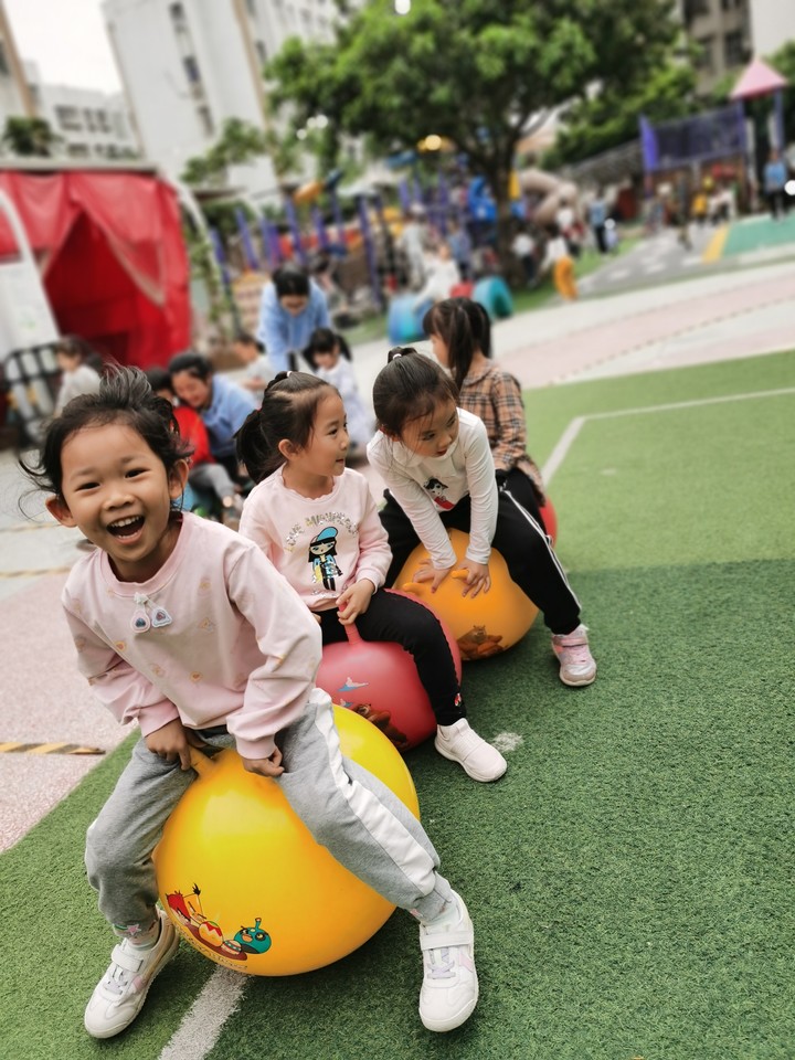 幼儿每天的户外活动时间都有达到两个小时哦,看!我们在玩体育器械,我们选择的是羊角球。