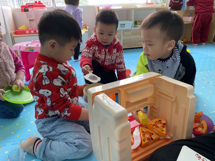 积木拼好了吗,会是什么呢?我的是高楼,你的是小汽车。