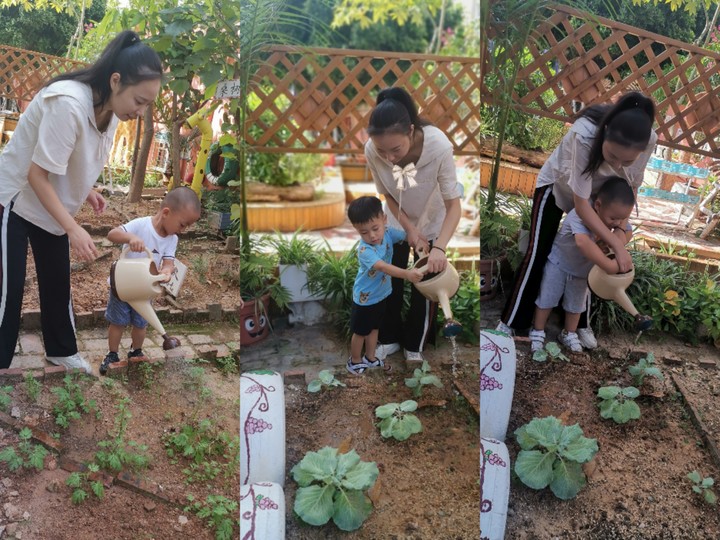 我们在给小菜苗泥土松松土呢,小菜苗你要快快长大哦。