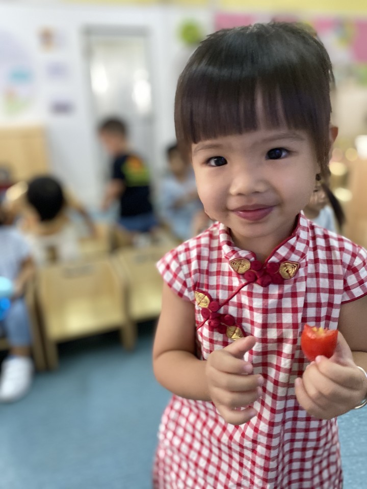 多吃水果身体好,圣女果跟我的裙子都是红红的。